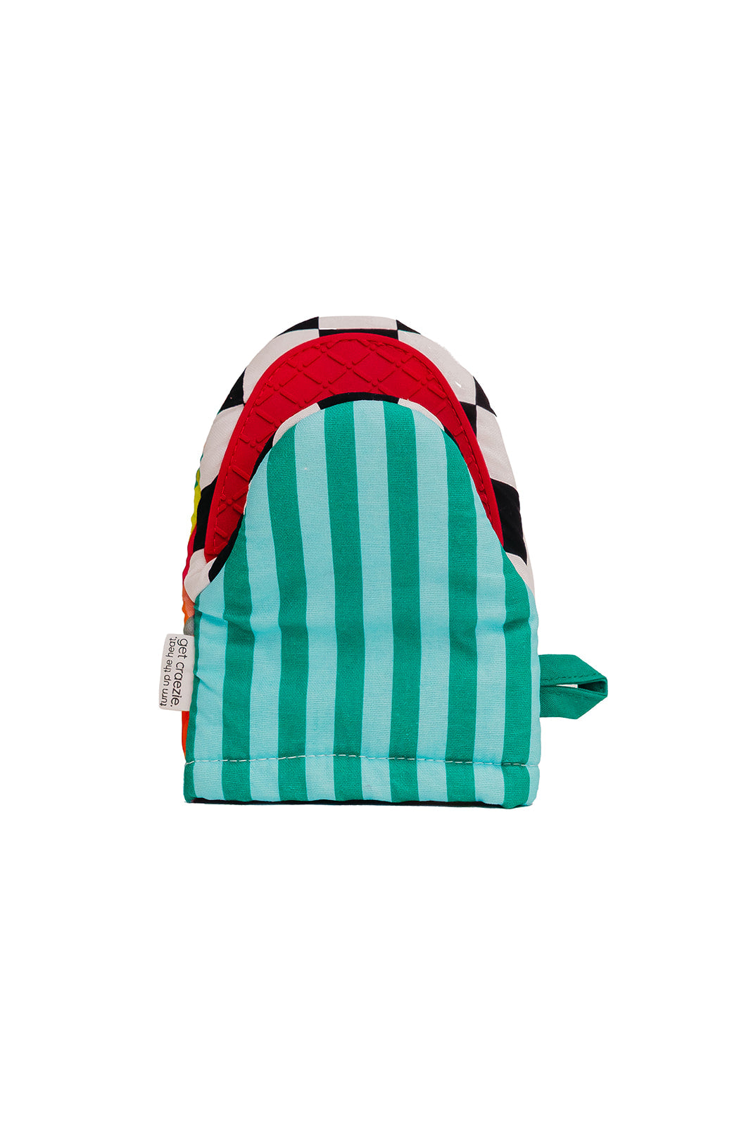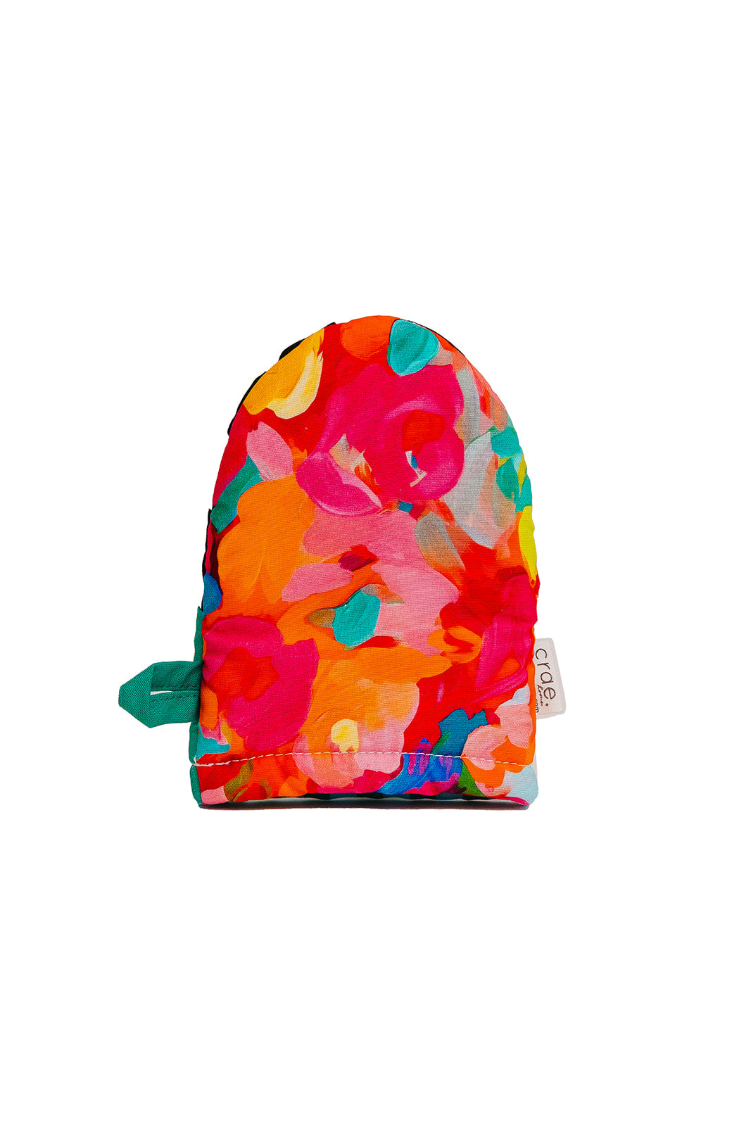 The mini oven mitt is made from soft cotton with a cheerful mix of prints and a silicone-lined grip inside for a secure hold on hot pans and baking trays. Measuring 7.5” x 5.5”, it fits comfortably on either hand and includes a hanging loop for easy storage (or display!).