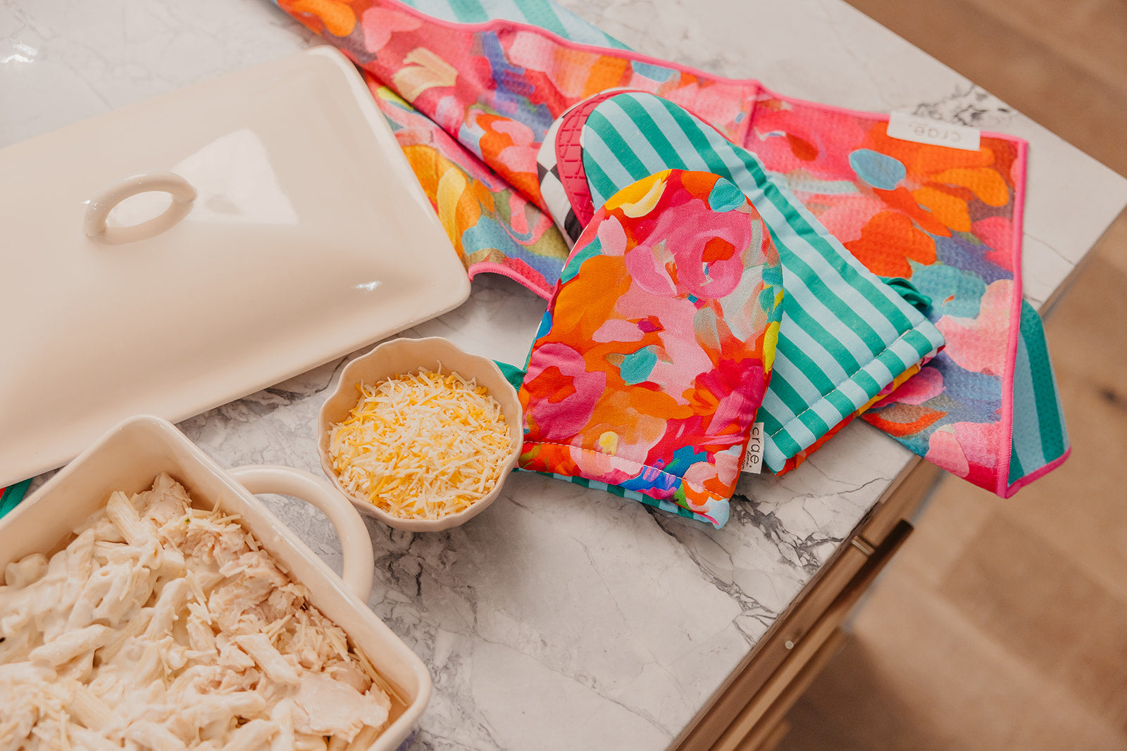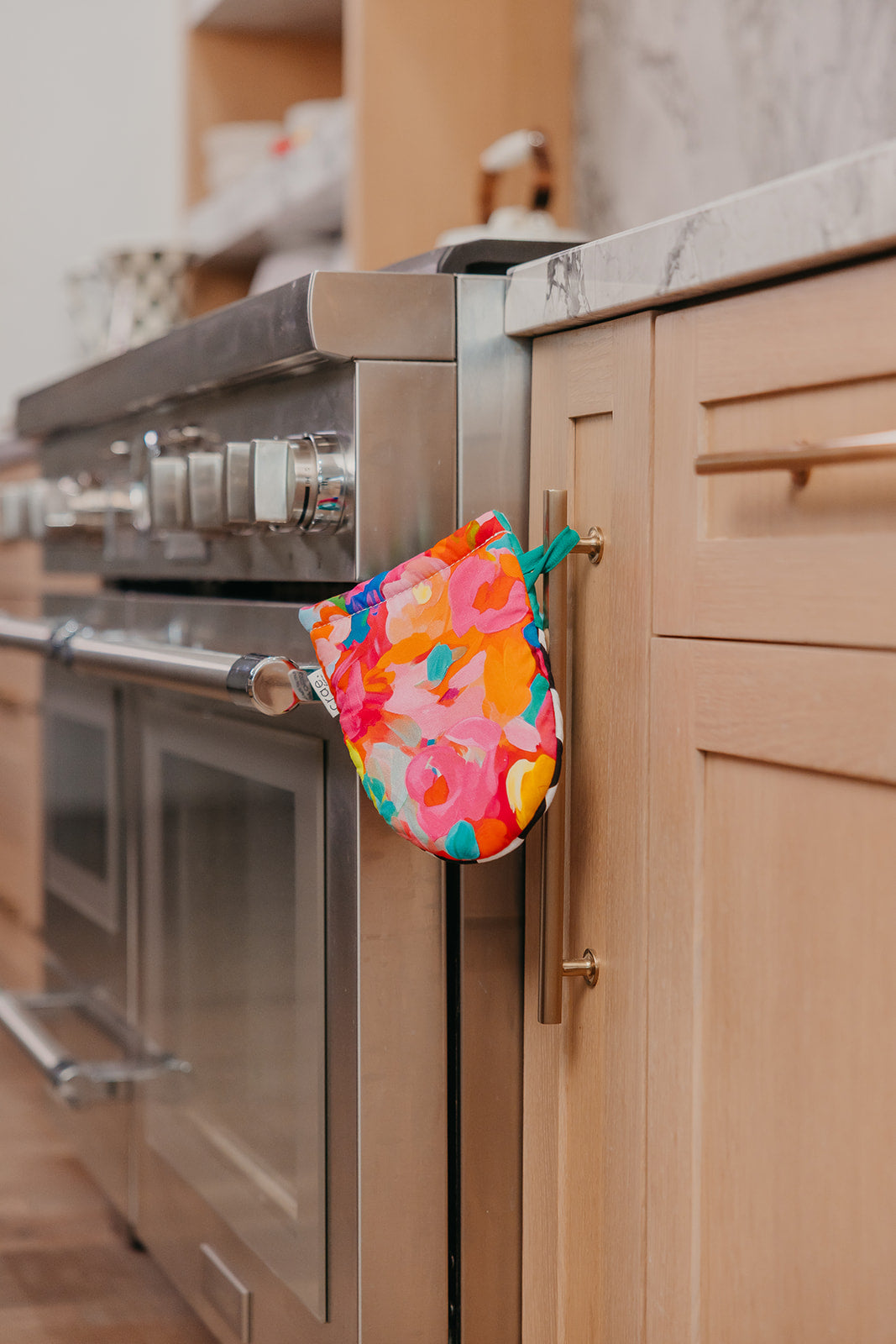 Small but mighty! This adorable mini mitt packs all the charm and function of our full-size version in a shorter, handier size. Made from soft cotton with a cheerful mix of prints, it features a silicone-lined grip inside for a secure hold on hot pans and baking trays. Measuring 7.5”x 5.5”, it fits comfortably on either hand and includes a hanging loop for easy storage (or display!). Cute, cozy, and perfectly sized for quick grab everyday cooking moments! Turn up the heat and get crae.