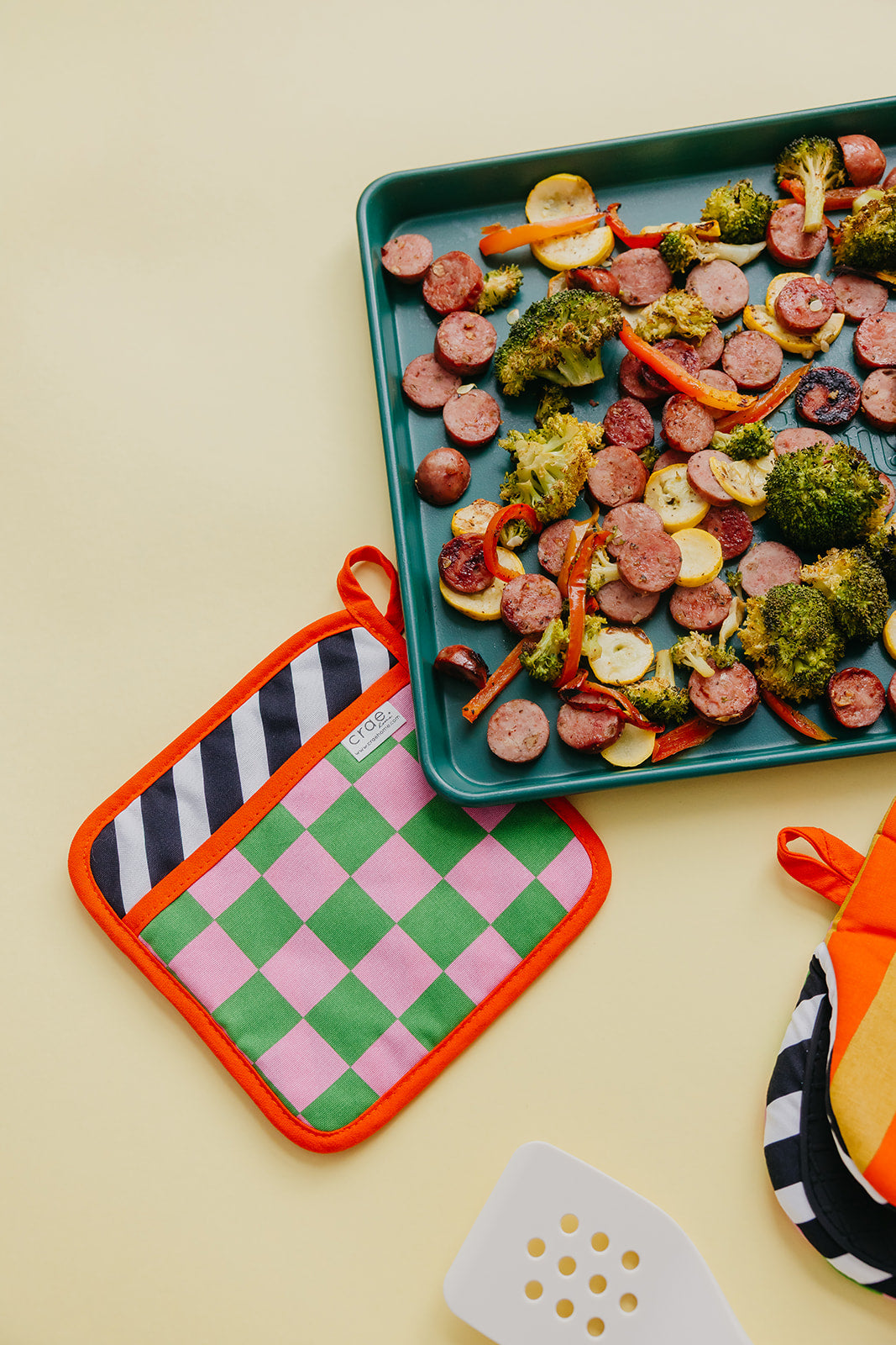 The matching pot pad completes the look with the same fun mix of prints and thick, heat-resistant design. It’s perfect for protecting hands, counters, and tabletops from hot dishes, while staying soft, durable, and kitchen-ready. A built-in hanging loop makes it easy to keep within reach.